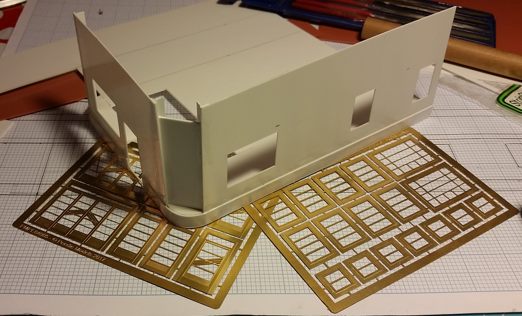 Also shown are the etched brass windows and doors. These were sourced online from Peedie Models in their Southern Moderne range. They are now available from Online Models Ltd in their Model Railway Features range.