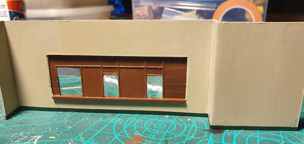 A view of the building from the front of the layout. The large window and door will belong to a taxi firm, with the window opaque with the company logo, and there should be a nice big sign above. The 2 smaller windows to the right are for the ladies waiting room, the door for which comes off the station concourse, hence they are up at platform level.