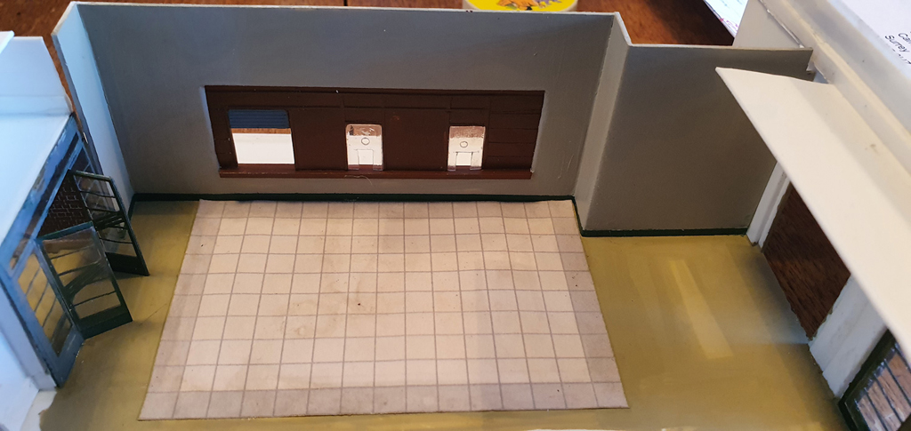 The pre-prepared wall was then glued in place, with the floor already having been painted concrete. I noticed in pictures of Surbiton station, that there was a nice marble tiled floor in the central area of the concourse.