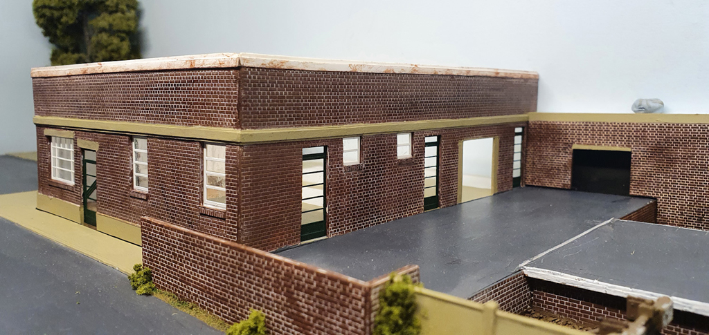 Once I had completed the shell of the building, it needed painting before adding the windows. Any part needing to be concrete were painted using Polly Scale Acrylic Aged Concrete, imported from the US, and sadly no longer in production. I’m on my last bottle unfortunately, so will need to find a suitable replacement. The brickwork was painted in a base colour of Tamiya Acrylic Red Brown 2. Once dry, to create the mortar, Vallejo ivory was painted over the brick, left for a couple of seconds, and then wiped off with a paper towel. This leaves the colour between the bricks and also helps to tone down the brick red colour. Once this was dry, I then go over the brickwork with various shades of red brown paint, dry-brushed on, to vary the brick tones.