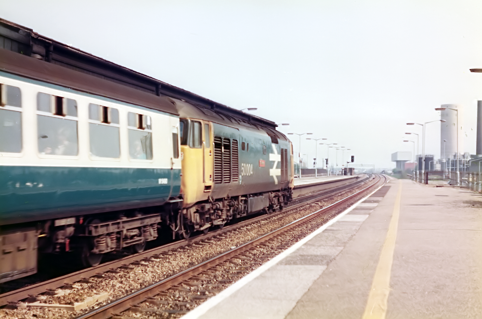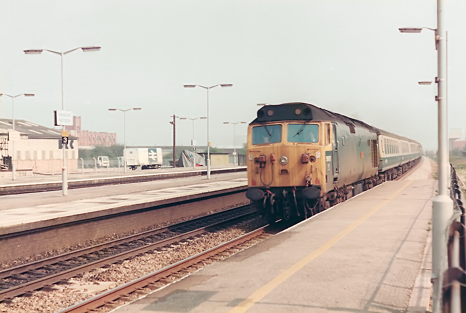 Class 50 50004 St Vincent in Large Logo livery heads Eastbound to London Paddington through Hayes and Harlington station, in the mid-1980's.