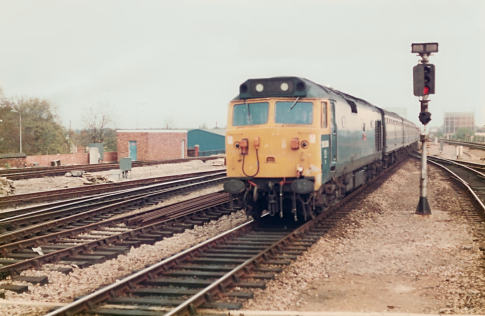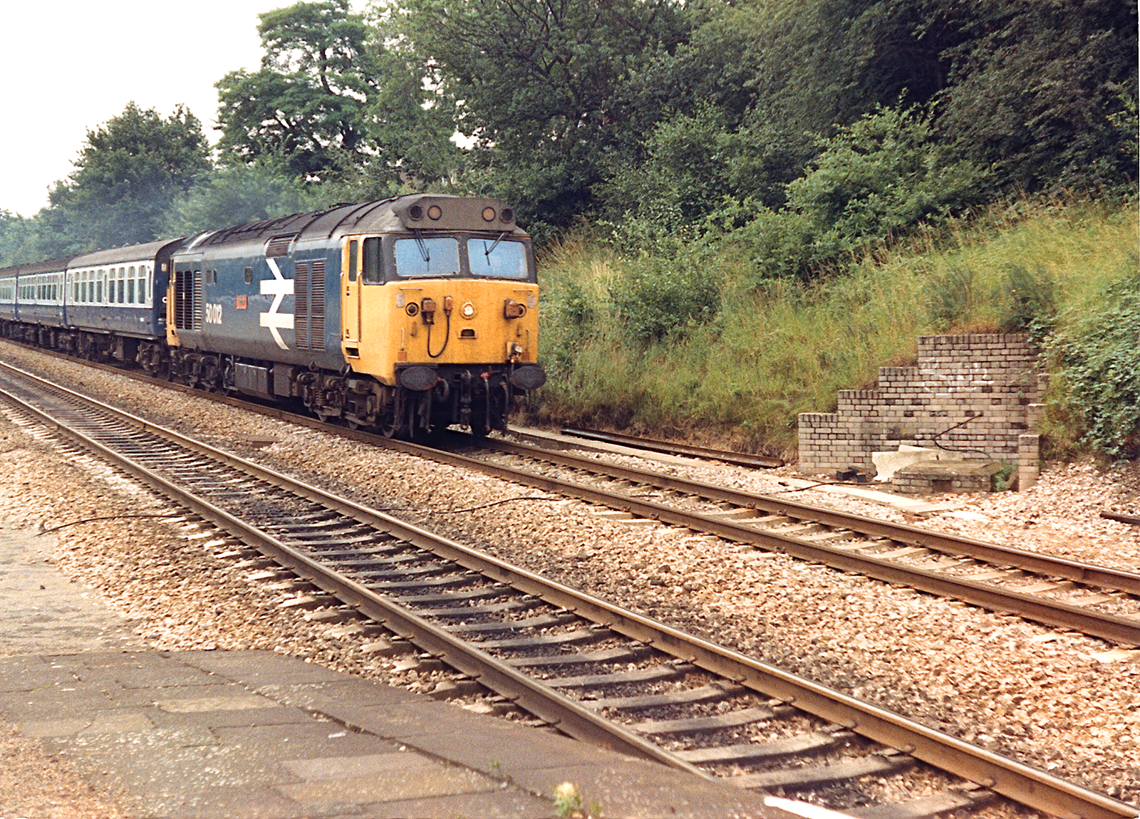 Class 50 50008 Thunderer slowing to stop at Reading, with what looks to be an eastbound Paddington to Oxford or Newbury service in the early 1980's. Thunderer would only remain in BR Blue for a little longer, being refurbished and outshopped in Large Logo blue livery in December 1981.