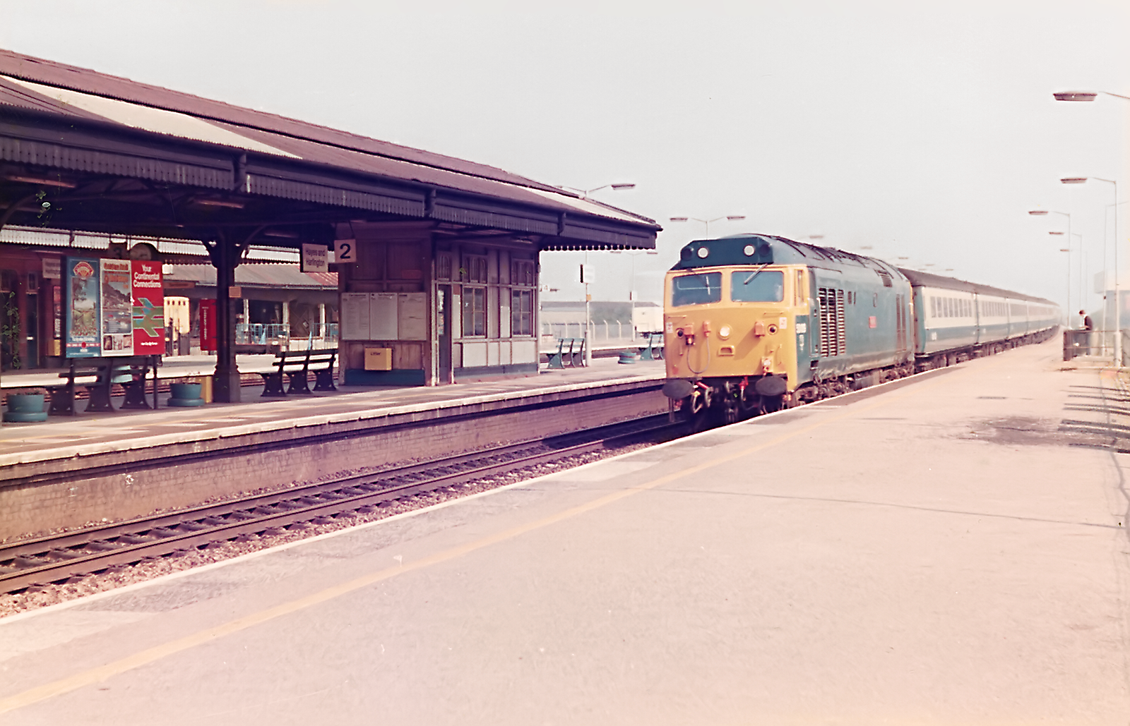 Class 50 50014 Warspite pauses at Platform 4 of Reading station. Warspite was refurbished and gained it's Large Logo livery in December 1983, so this photo would be after that date, but before December 1987, when it was withdrawn from traffic. Scrapping sadly followed by July 1989.