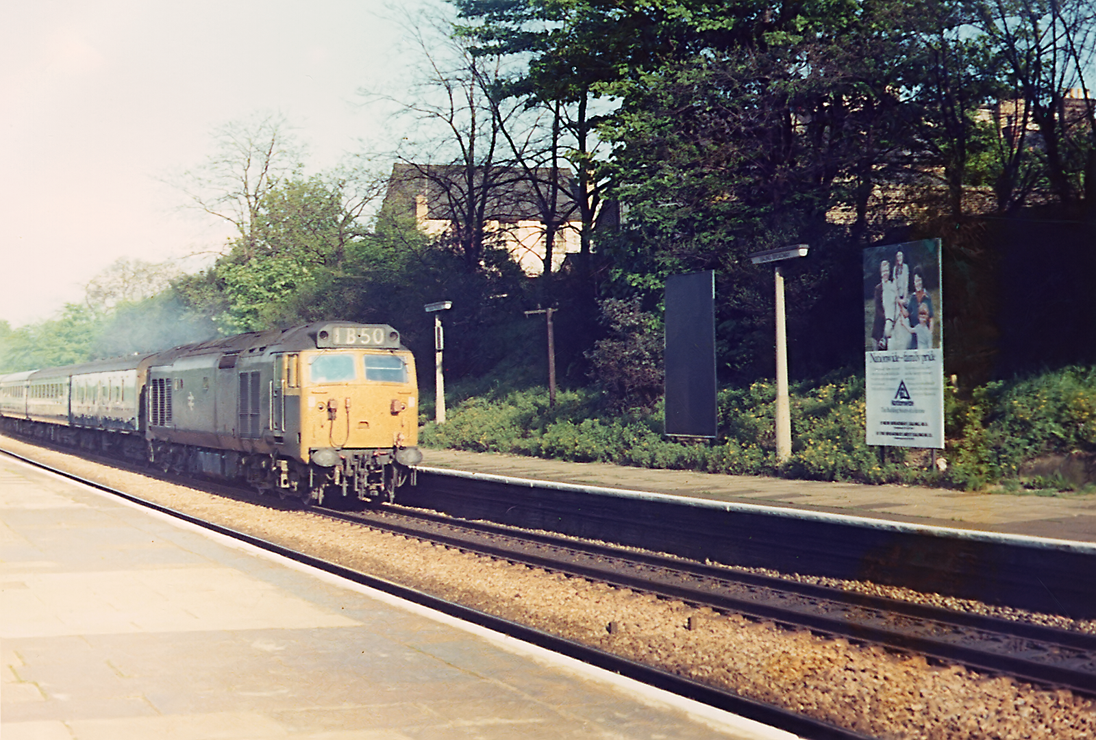 Class 50 50012 Benbow storms through Ealing Broadway with an eastbound Paddington to Oxford or Newbury service in the mid 1980's.