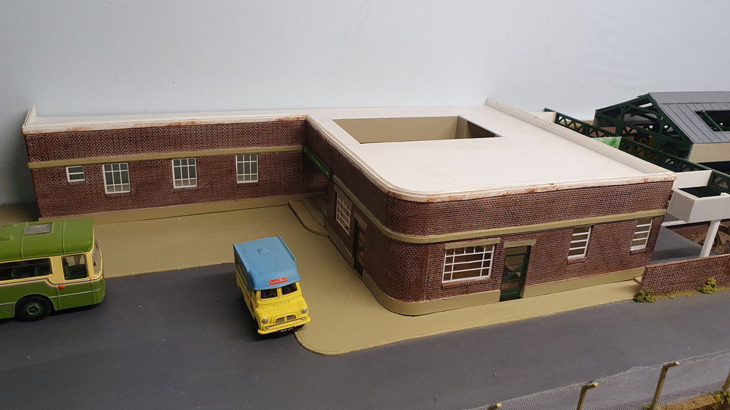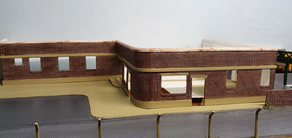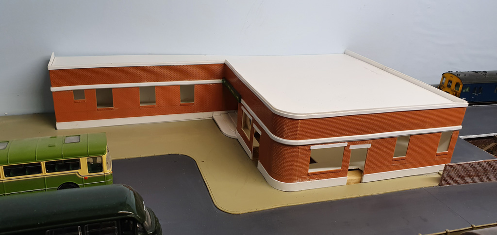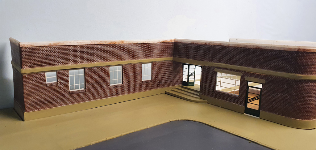 A view of the building from the front of the layout. The large window and door will belong to a taxi firm, with the window opaque with the company logo, and there should be a nice big sign above. The 2 smaller windows to the right are for the ladies waiting room, the door for which comes off the station concourse, hence they are up at platform level.