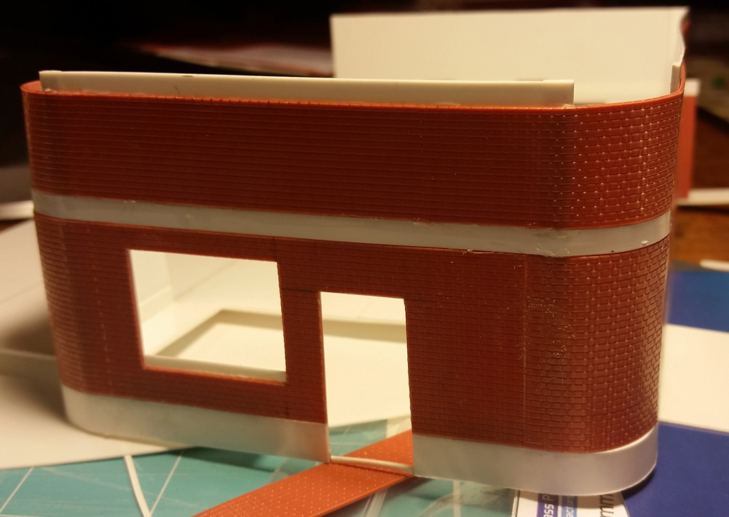 To get the brick to follow the curvature of the building, small panels were cut, which slightly overlapped the corner, and were then rolled around a piece of brass. One edge was glued first, and then the other edge glued. The rest of the walls were then added. If you look closely you can see the join on the lower section. Were I to do this again, I would probably either use a roller, or place it in some hot water, to pre-curve the entire wall piece.