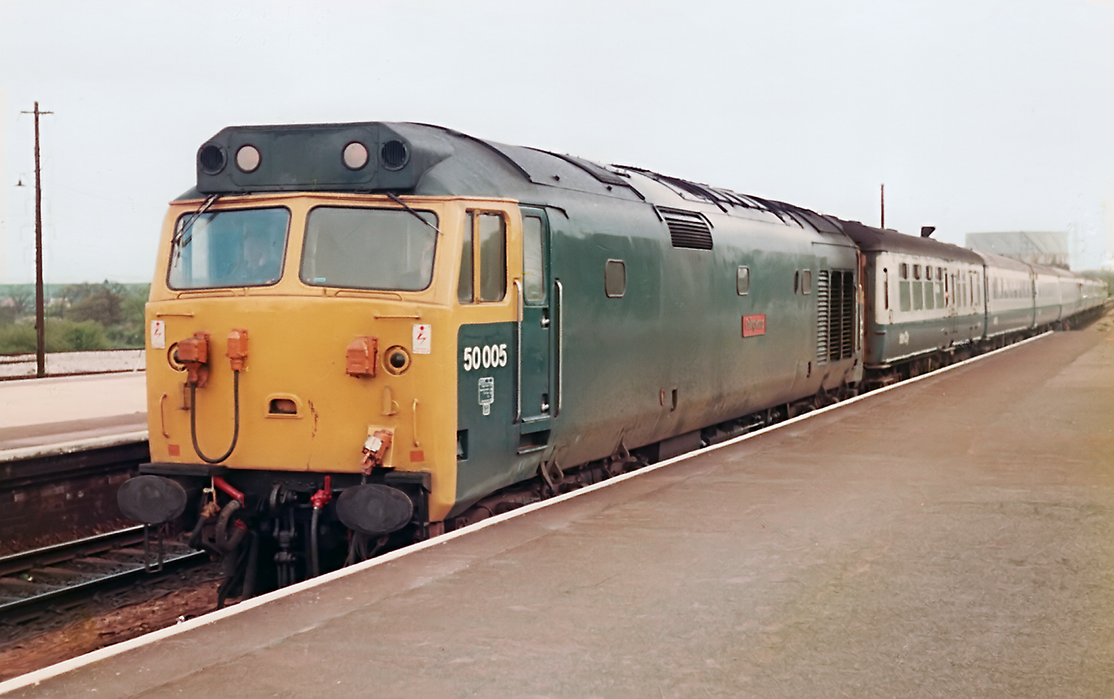 Class 50 50005 Collingwood heads a westbound express through Didcot. This is at some point prior to August 1982 when it would undergo refurbishment and be outshopped in Large Logo livery.