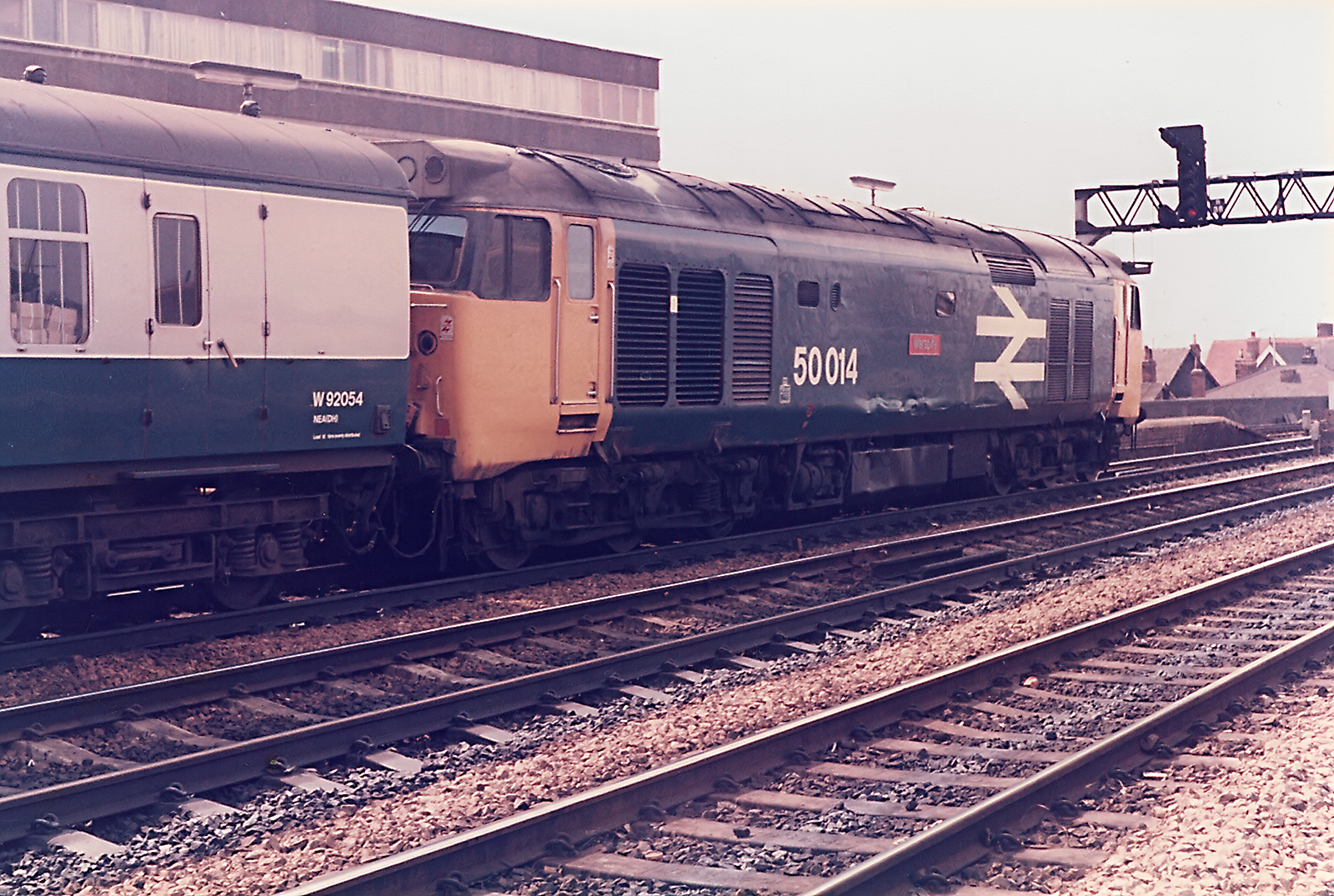 Class 50 50014 Warspite pauses at Platform 4 of Reading station. Warspite was refurbished and gained it's Large Logo livery in December 1983, so this photo would be after that date, but before December 1987, when it was withdrawn from traffic. Scrapping sadly followed by July 1989.